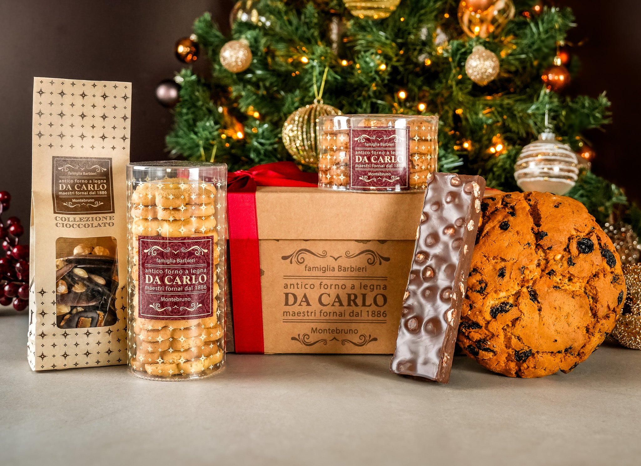 Cioccolato fondente 61%: (fave di cacao, zucchero, burro di cacao, emulsionante: lecitina di SOIA e GIRASOLE, estratto naturale di vaniglia, LATTE), Cioccolato finissimo al latte 35%: (zucchero, burro di cacao, LATTE in polvere, pasta di cacao, siero di LATTE in polvere, emulsionante: lecitina di SOIA e GIRASOLE), Cioccolato bianco: (burro di cacao, LATTE intero in polvere, zucchero, emulsionante: lecitina di SOIA e GIRASOLE, estratto naturale di vaniglia), NOCCIOLE, MANDORLE, PISTACCHIO, arancia candita.