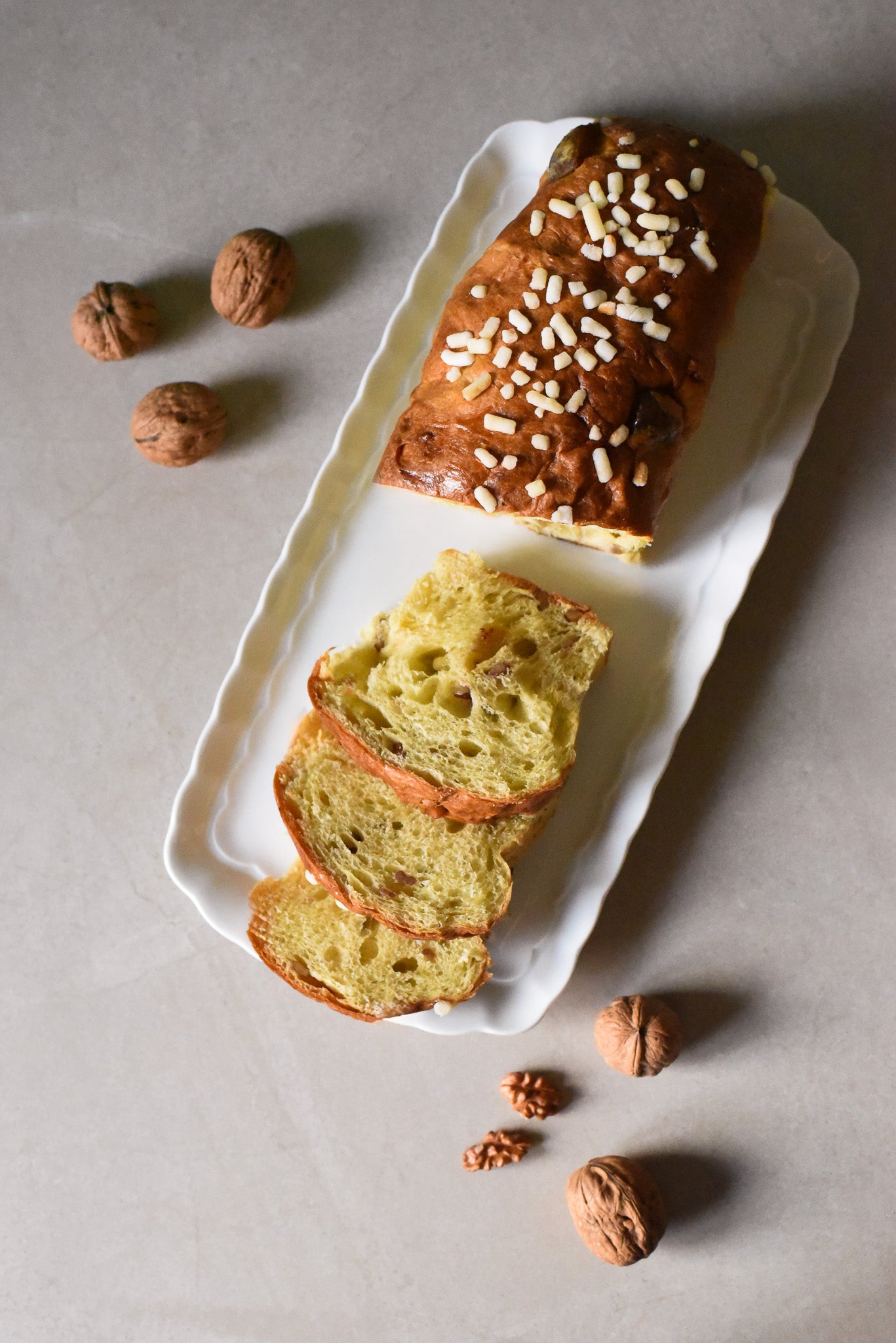 FARINA di FRUMENTO tipo 00, fichi canditi (fichi, sciropppo di glucosio), BURRO, tuorlo d’UOVO, lievito madre, zucchero, sale, vaniglia, NOCI. Può contenere tracce di frutta a guscio.