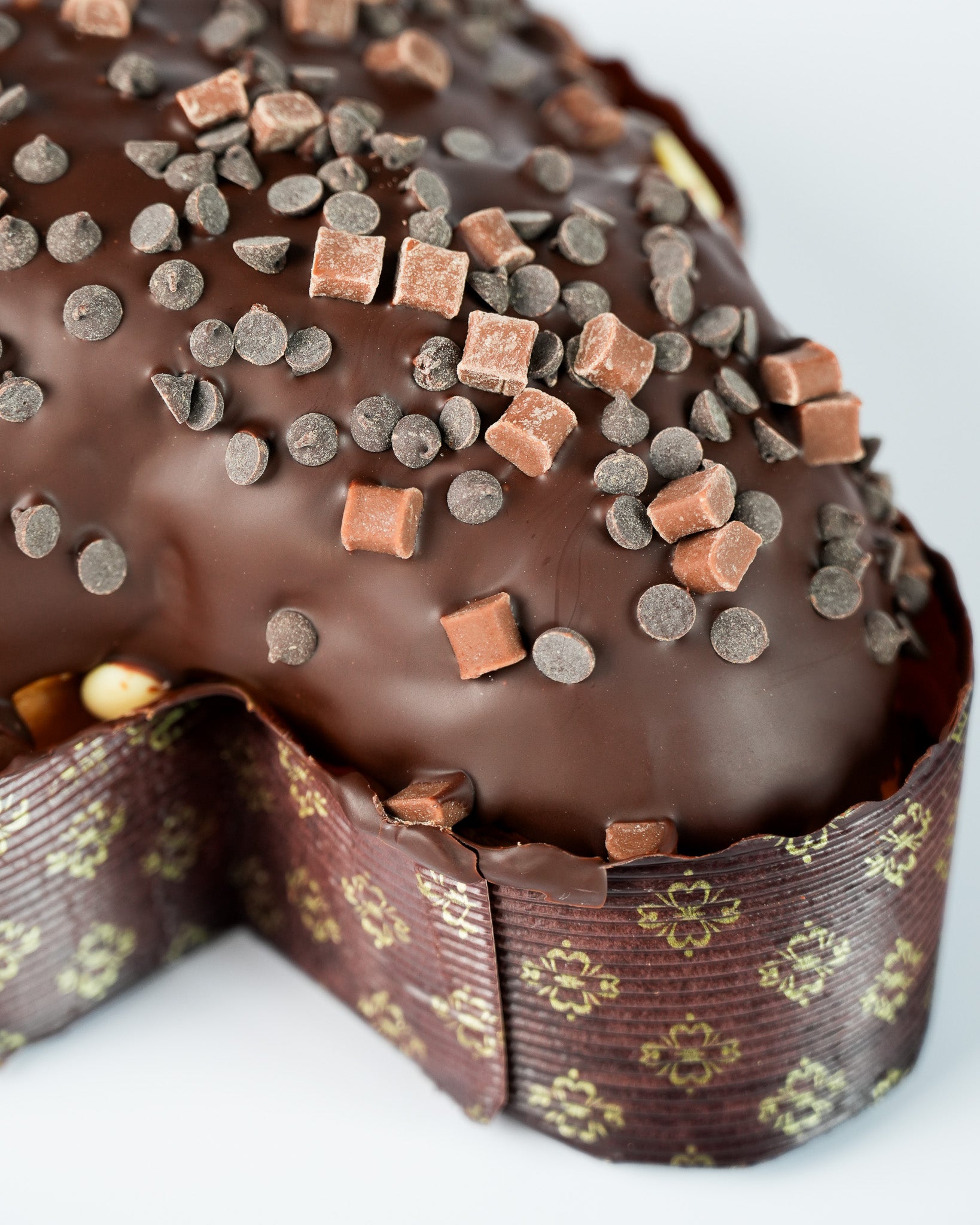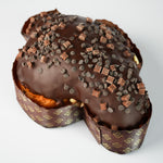 La copertura di cioccolato fondente completa la colomba con una nota più intensa, creando un equilibrio armonioso tra dolcezza e carattere.